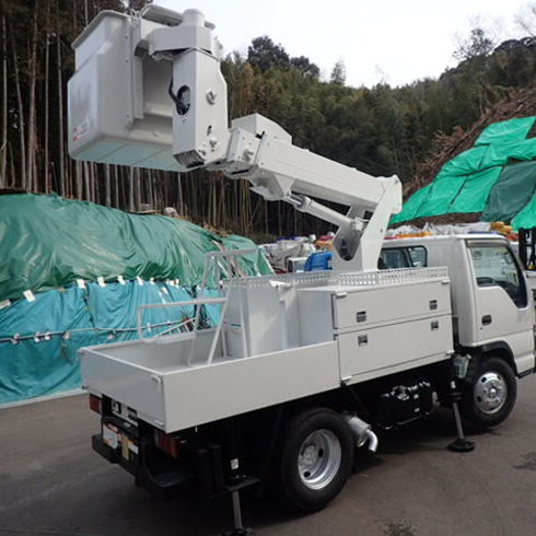 狭い路地への進入や交通量の多い道路でも通信工事、外壁・外構工事や看板設置、信号機や街路灯の点検補修、各種メンテナンス等、様々な現場で幅広い作業に対応できます。