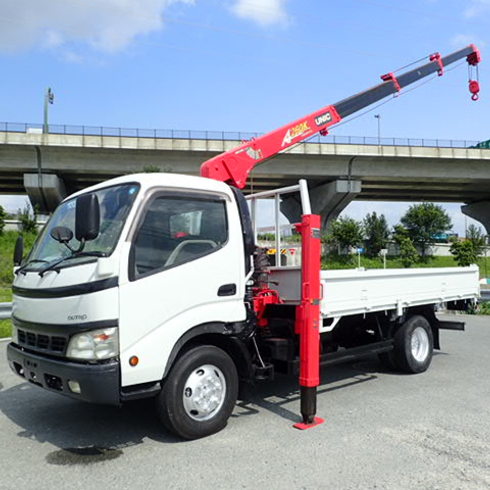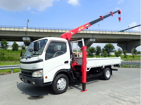 H15 ヒノデュトロ 3.5t ハイジャッキセルフ 4段クレーン ラジコン フックイン 重機運搬車 ワイドロング 車両全塗装済